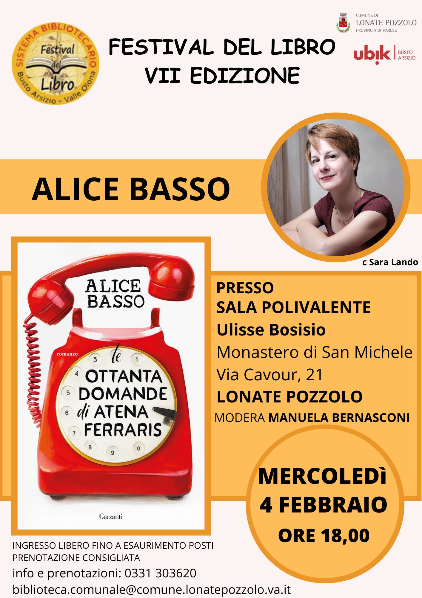 Nell'ambito della VII edizione del Festival del libro del Sistema bibliotecario Busto - Ticino - Valle Olona, Alice Basso presenta il suo ultimo romanzo "Le ottanta domande di Atena Ferraris" a Lonate Pozzolo.